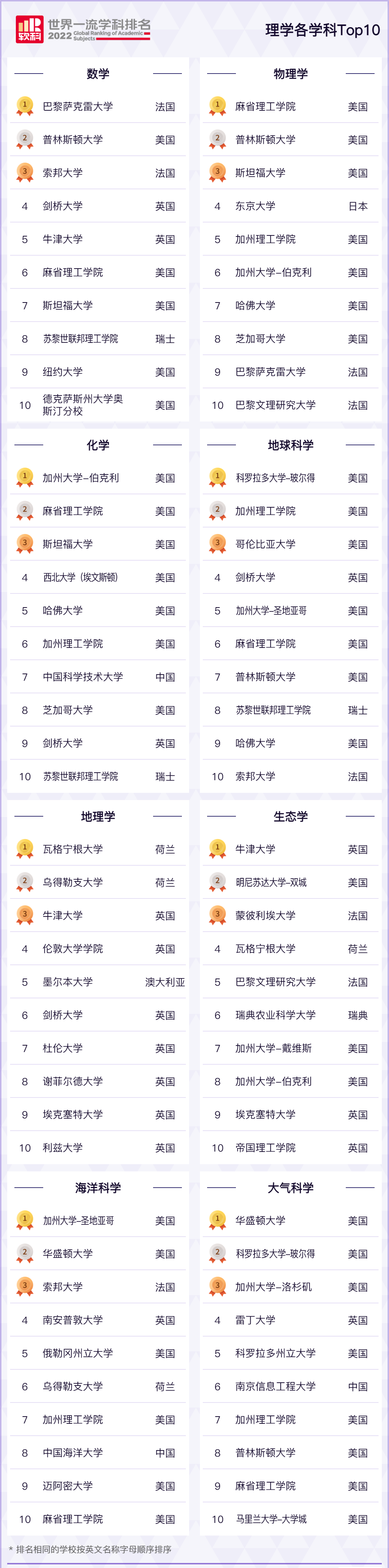 理学排名中,美国、英国、法国的大学排名相对靠前。在海洋科学领域,TOP1则由去年次位的加州大学-圣地亚哥取代。