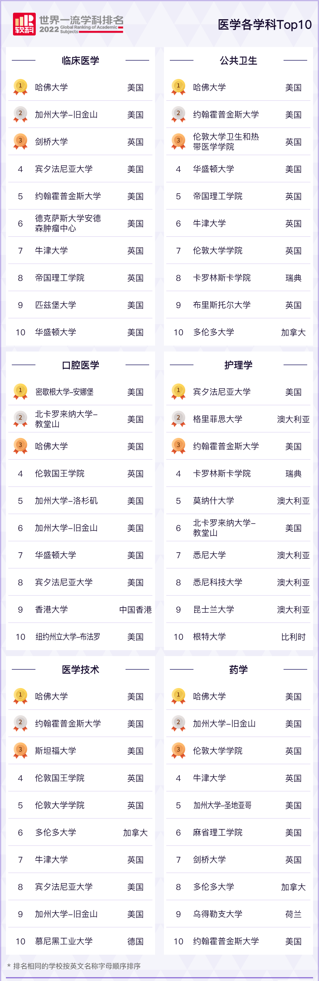 医学专业美国依旧包揽了前列,其中,哈佛大学占据了4门学科的全球#1;另外加拿大多伦多大学在今年的学科排名中进步很大,在医学技术专业上升3位,位居TOP6;在药学专业上升2位,位居TOP8。