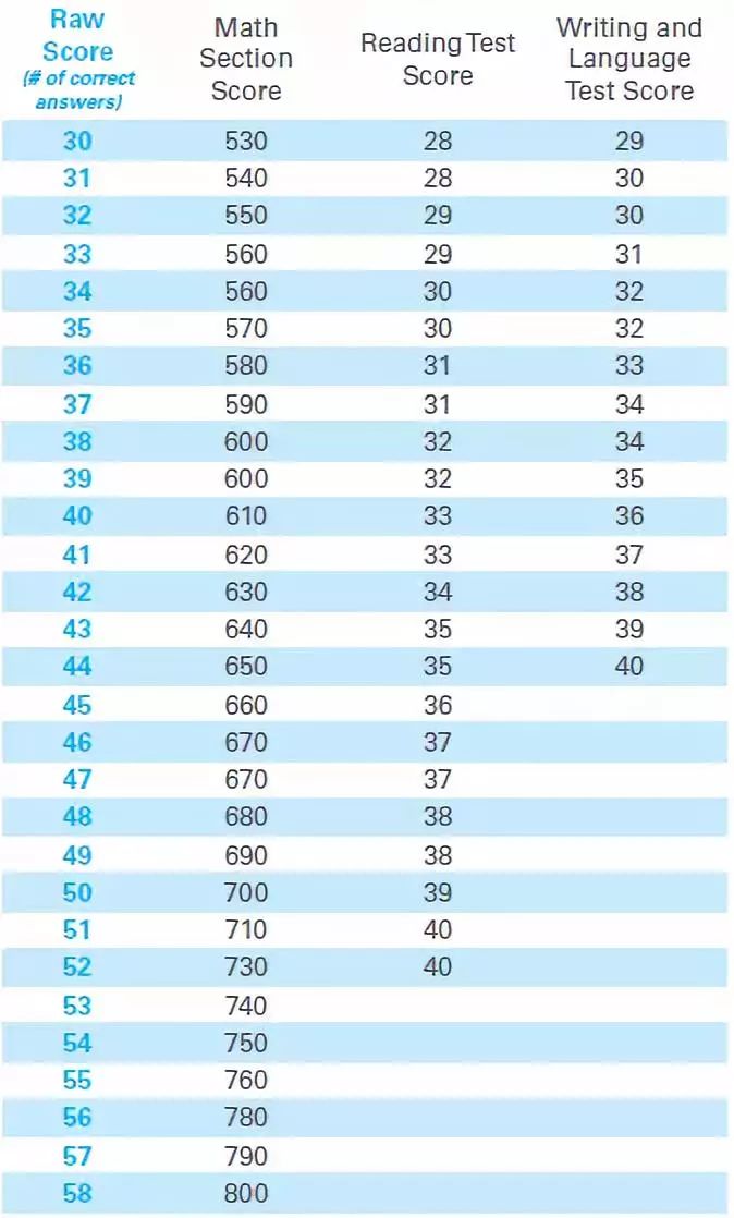 即:将阅读的正确题目数换算成10分至40分的成绩(依照分数换算表),再将语法部分的正确题目同样换算成10分至40分的成绩,两者相加再乘十,即为第二个800分。例如,阅读共52题,做对44道题(错8题)得35分;语法共44题,做对39题(错5题)可得35分,两者相加再乘10,此时总分为700分。