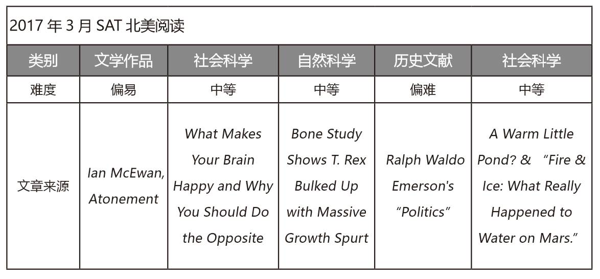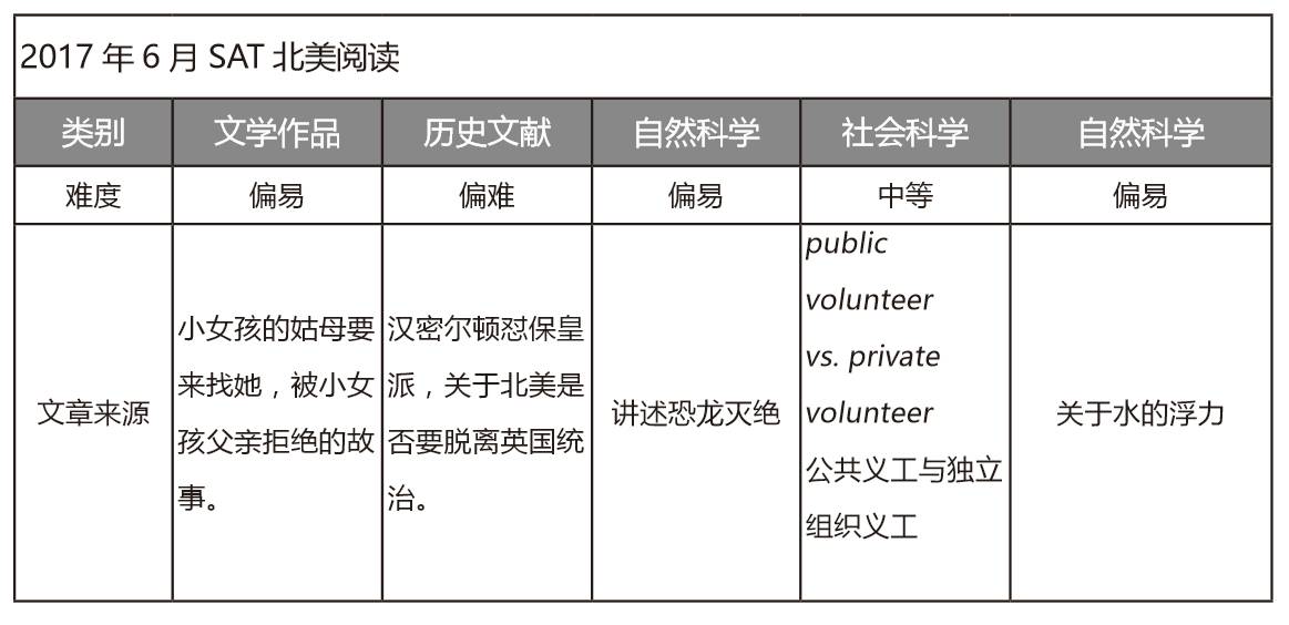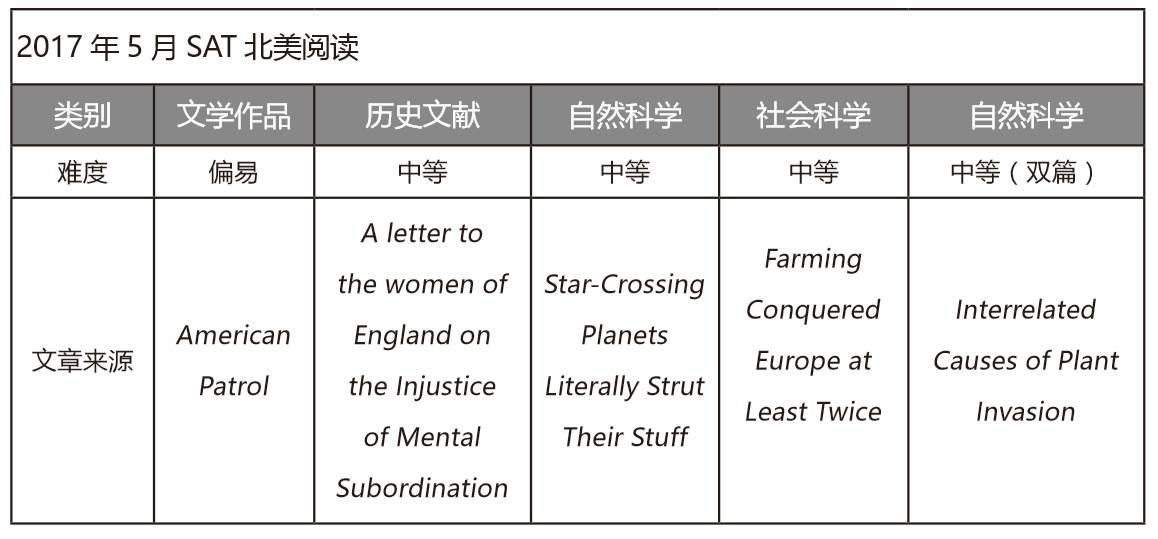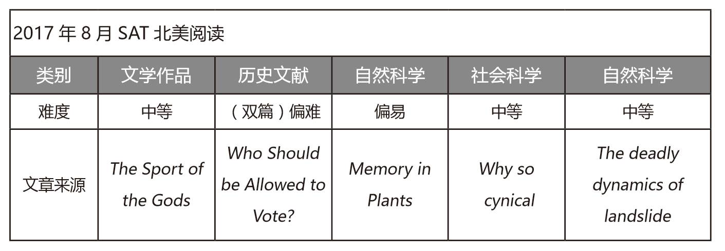 由于德州受飓风影响,八月北美 SAT 考试部分考场被迫取消,时间统一到 9 月 9 号进行补考,幸运的是大部分考场还是按照原计划进行考试。 对于今年 SAT 阅读,我们选取部分北美考场的考题采用图表形式从考试类别,难易程度以及文章来源三方面进行纵向对比,为大家在考前备考及背景知识的储备提供方向。