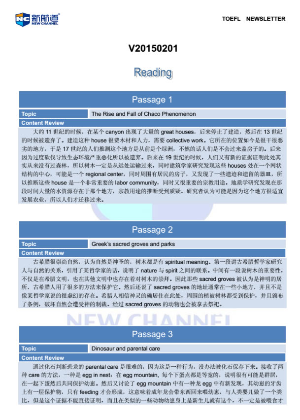 2015年2月1日的托福考试已经结束,还没拿到成绩的同学想要根据托福机经来分析一下自己的考试情况吧,北京新航道“托福师资团队”师资在考试后时间为你回忆及解析2月1日托福考试,专业解读托福听力、口语、阅读、写作考试情况。我们一起来看本次托福阅读机经内容: