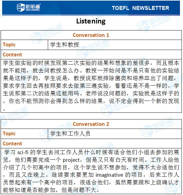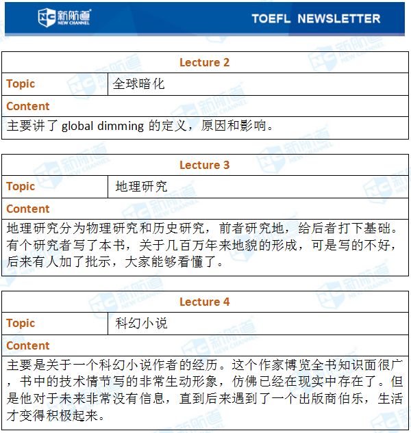 听力部分难度也很大,同样有加试。Lecture部分主要有global dimming、地理研究、科幻小说、艺术学、生物学等方面的内容。