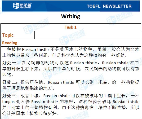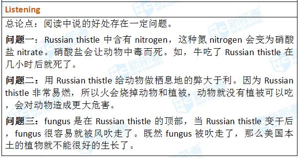 综合写作topic:Russian thistle的好坏。阅读部分指出了它的3点好处;听力部分则指出了阅读中说的好处所存在的3个问题。