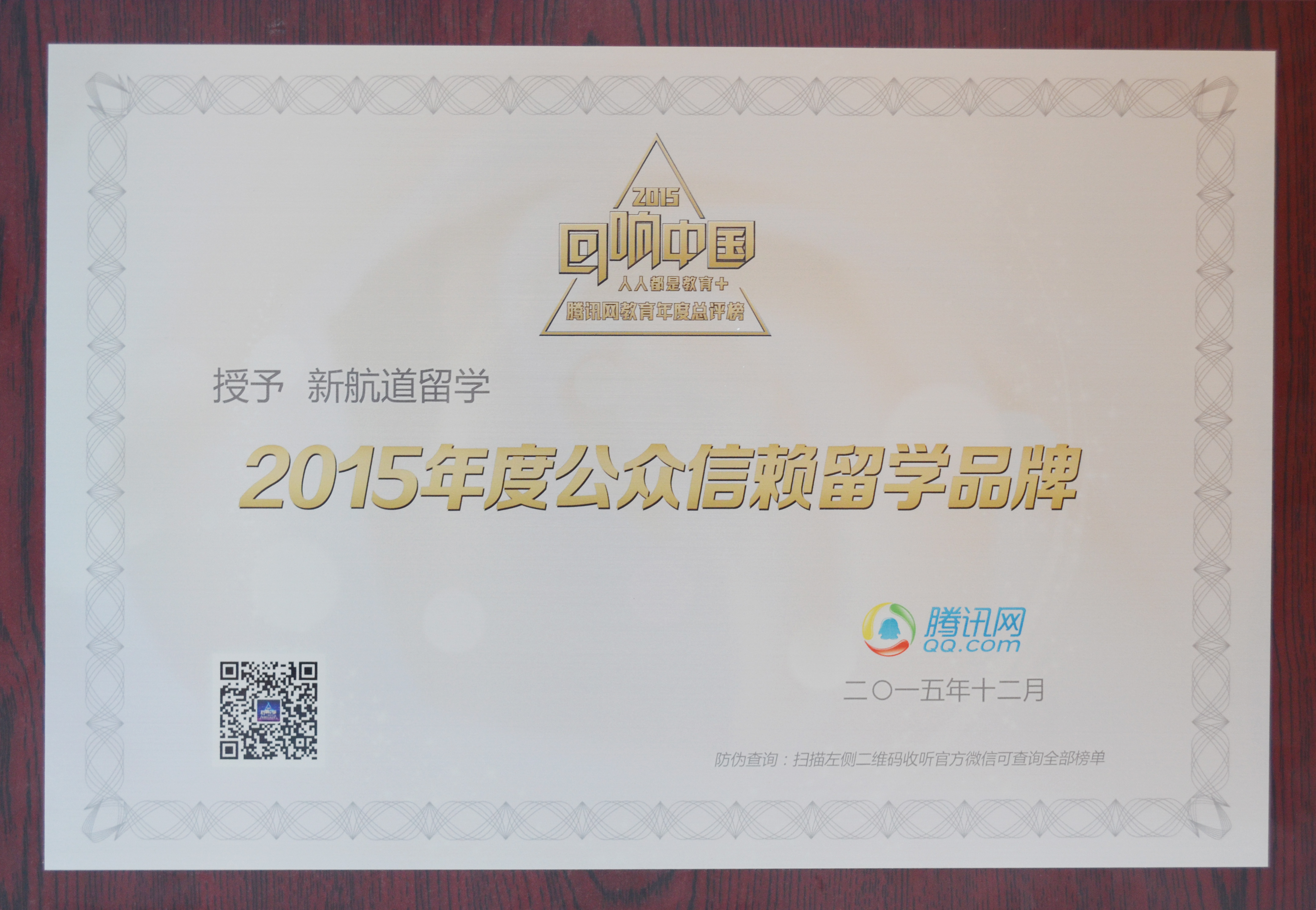 2015年12月1日,一年一度的“回响中国”腾讯网教育年度盛典在北京隆重举行。新航道集团、新航道留学斩获总评榜双料大奖:新航道国际教育集团获“2015年度影响力教育集团”,新航道留学获“2015年度公众信赖留学品牌”。