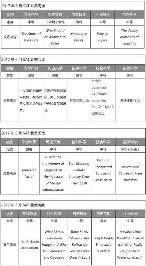 由于德州受飓风影响,八月北美 SAT 考试部分考场被迫取消,时间统一到 9 月 9 号进行补考,幸运的是大部分考场还是按照原计划进行考试。 对于今年 SAT 阅读,我们选取部分北美考场的考题采用图表形式从考试类别,难易程度以及文章来源三方面进行纵向对比,为大家在考前备考及背景知识的储备提供方向。