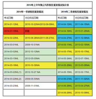 以上数据显示,21 套独立写作题目中,各有4次重复 2013 年机经真题;5 次重复 2012 机经真题;3 次重复 2011 年机经真题;5 次重复 2010 年机经真题;2次重复 2009 年机经真题;1 次重复 2008 年机经真题。整个 2014 上半年,只有 1 道新题,其余 20 题均以重复近 4 年原题为主,原题重复率高达 95%。不难预测,2014 年下半年的独立写作将以重复近几年北美机经为主,并且在后半年的重复频率会更高。其中,根据二季度出题趋势,考生应尤其关注 2013-2011 年的北美机经,将机经练习作为平时复习备考的重点。